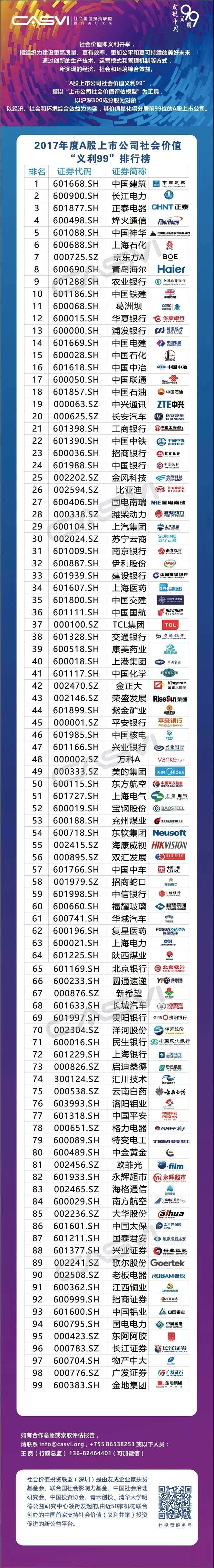 在社投盟的牵头下,深交所综合研究所、中国投资协会、银河证券、中证指数公司等42家机构、来自经济、社会、环境、管理、人文等领域的68名中外专家通过“跨界协同”、“智慧众筹”的方式评估完成了报告,产生了首份A股上市公司“义利99”排行榜,中国建筑、长江电力、正泰电器、烽火通信、中国神华、上海石化、京东方A、青岛海尔、农业银行、中国铁建荣获前十强。(完整榜单附后)