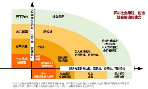 议题公共性、公平性、紧迫性越强(Aim),解决方案越创新、越系统(Approach),执行力越强(Action),其所产生的社会价值越大。在假设执行力一致的情况下,可从社会议题与解决方案两个维度直接比较出所创造社会价值的区别。