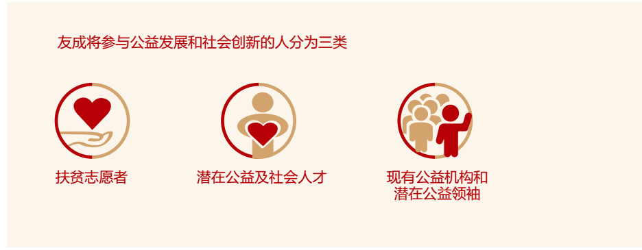友成定位为社会创新的平台支持型和倡导型基金会,友成的三个战略支持平台是研发倡导、实验孵化、资助合作。这既区别于草根 NGO 的服务性组织,也区别于实操型的公募基金会和资助型的非公募基金会。